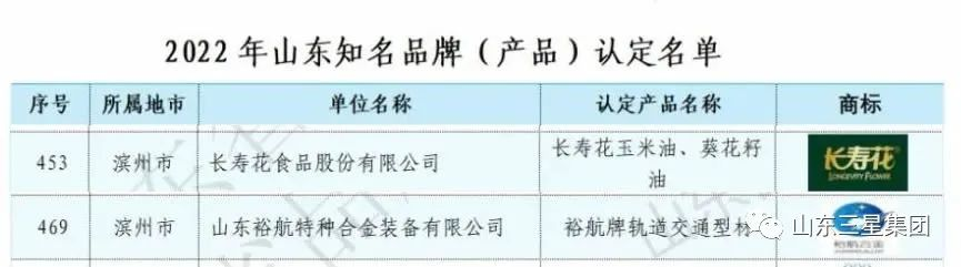 近日,2022年山東知名品牌認定名單發(fā)布,來自全省541家組織的502個產(chǎn)品、97個服務(wù)項目上榜,山東三星集團旗下長壽花玉米油、葵花籽油以及裕航合金軌道交通型材三個產(chǎn)品被認定為2022年山東知名品牌。