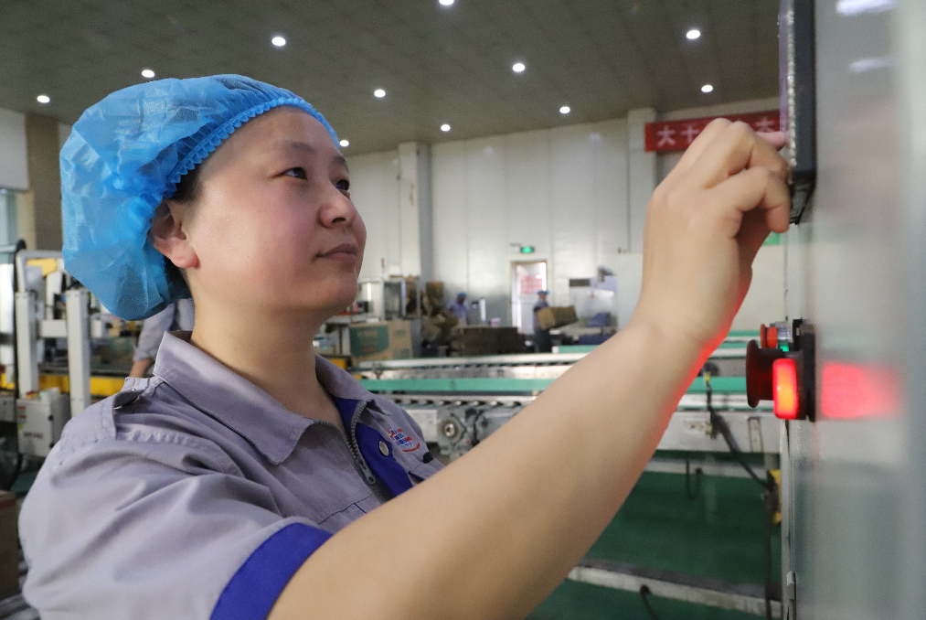 在包裝車間13年的工作生涯中,宋曉倩學(xué)習(xí)并實操了長壽花外包裝間的所有崗位,從第一份工作開箱起步,她就憑借沉穩(wěn)細心,用同崗位的高開箱和低損耗率,得到了車間領(lǐng)導(dǎo)和同事的肯定。隨著包裝設(shè)備的升級,加之多年的工作歷練,她不但能熟練操作設(shè)備,遇有突發(fā)情況也能沉著應(yīng)對、高效解決。封箱與碼垛都是生產(chǎn)線的最后崗位,必須要收好尾,更不能拖后腿。記得有一次轉(zhuǎn)產(chǎn)時,面對碼垛機程序故障可能導(dǎo)致滿垛傾倒危險時,宋曉倩憑借多年的實操經(jīng)驗,手動程序順利解決,從發(fā)現(xiàn)問題到恢復(fù)正常工作只用了5分鐘。