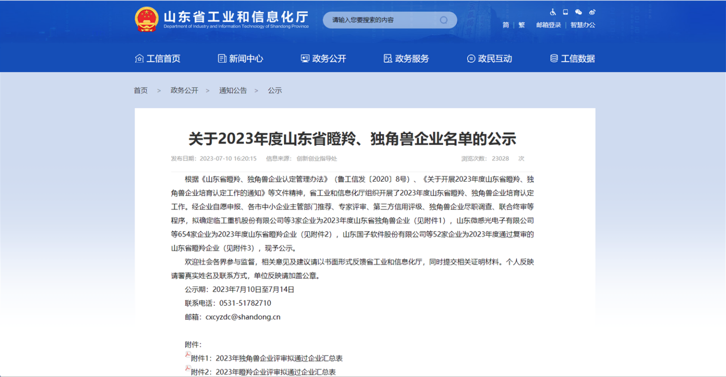 據(jù)悉,根據(jù)《山東省瞪羚、獨(dú)角獸企業(yè)認(rèn)定管理辦法》《關(guān)于開(kāi)展2023年度山東省瞪羚、獨(dú)角獸企業(yè)培育認(rèn)定工作的通知》等文件精神,省工業(yè)和信息化廳組織開(kāi)展了2023年度山東省瞪羚、獨(dú)角獸企業(yè)培育認(rèn)定工作。經(jīng)企業(yè)自愿申報(bào)、各市中小企業(yè)主管部門推薦、專家評(píng)審、第三方信用評(píng)級(jí)、聯(lián)合終審等程序,確定了2023年度山東省瞪羚、獨(dú)角獸企業(yè)名單。