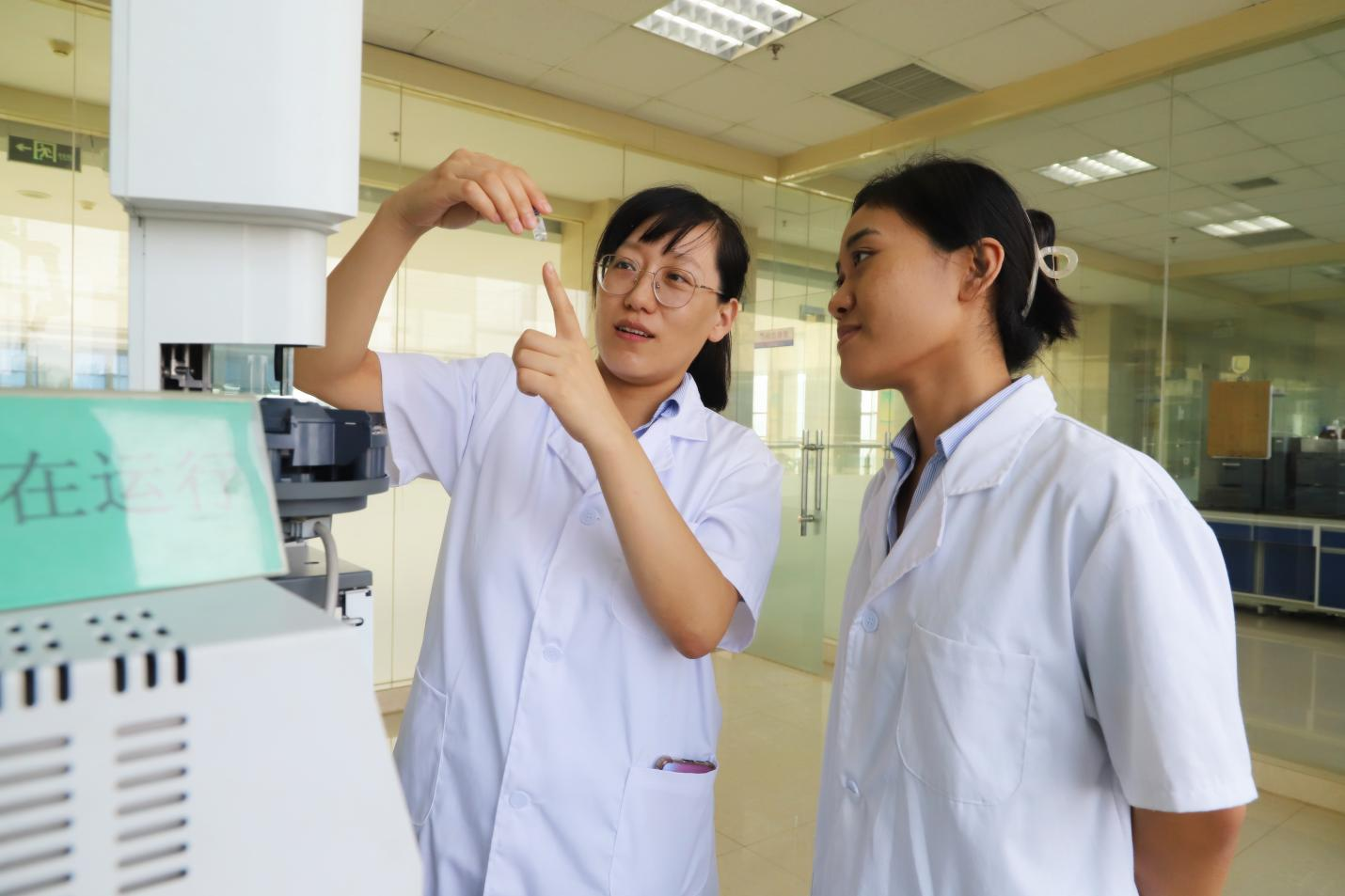 技術中心實驗現(xiàn)場,程芳園(左)與新員工楊新月正在就食用油中植物甾醇的含量檢測進行指導交流,討論實驗中的常見問題和解決方法,分享自己的心得體會、工作經(jīng)驗,幫助新員工提高分析效率和準確度。新老拍檔精誠攜手、思想碰撞,點燃科技創(chuàng)新的火花。