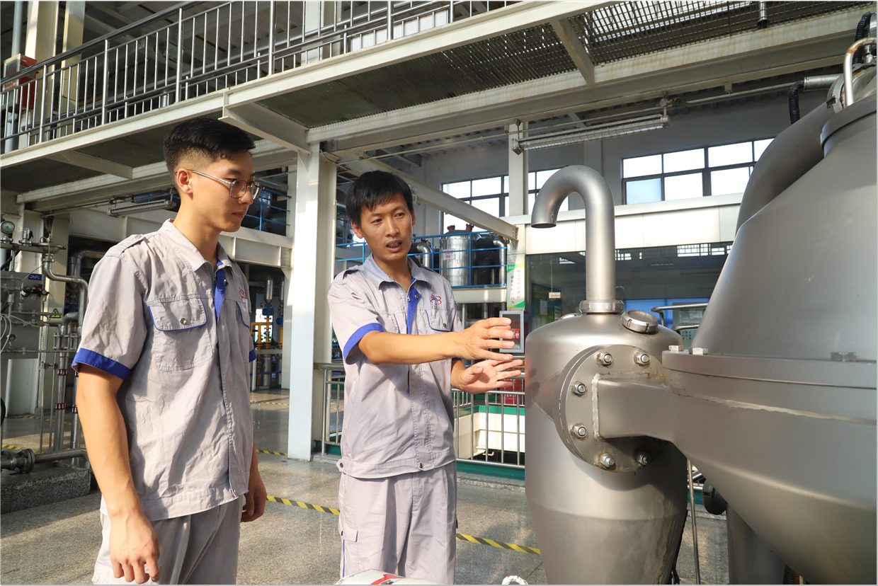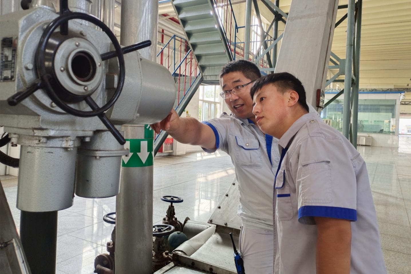 長壽花食品精煉三車間,馬海濤(右)向?qū)O慶金講解設備操作技能,如何做好實時監(jiān)測,優(yōu)化工藝指標,確保高效穩(wěn)定運行。這其中,傳授的不僅是技能和經(jīng)驗,還有初心使命和工作理念,也隨之一同入腦入心,扎實開啟“煉好油”的職業(yè)生涯。