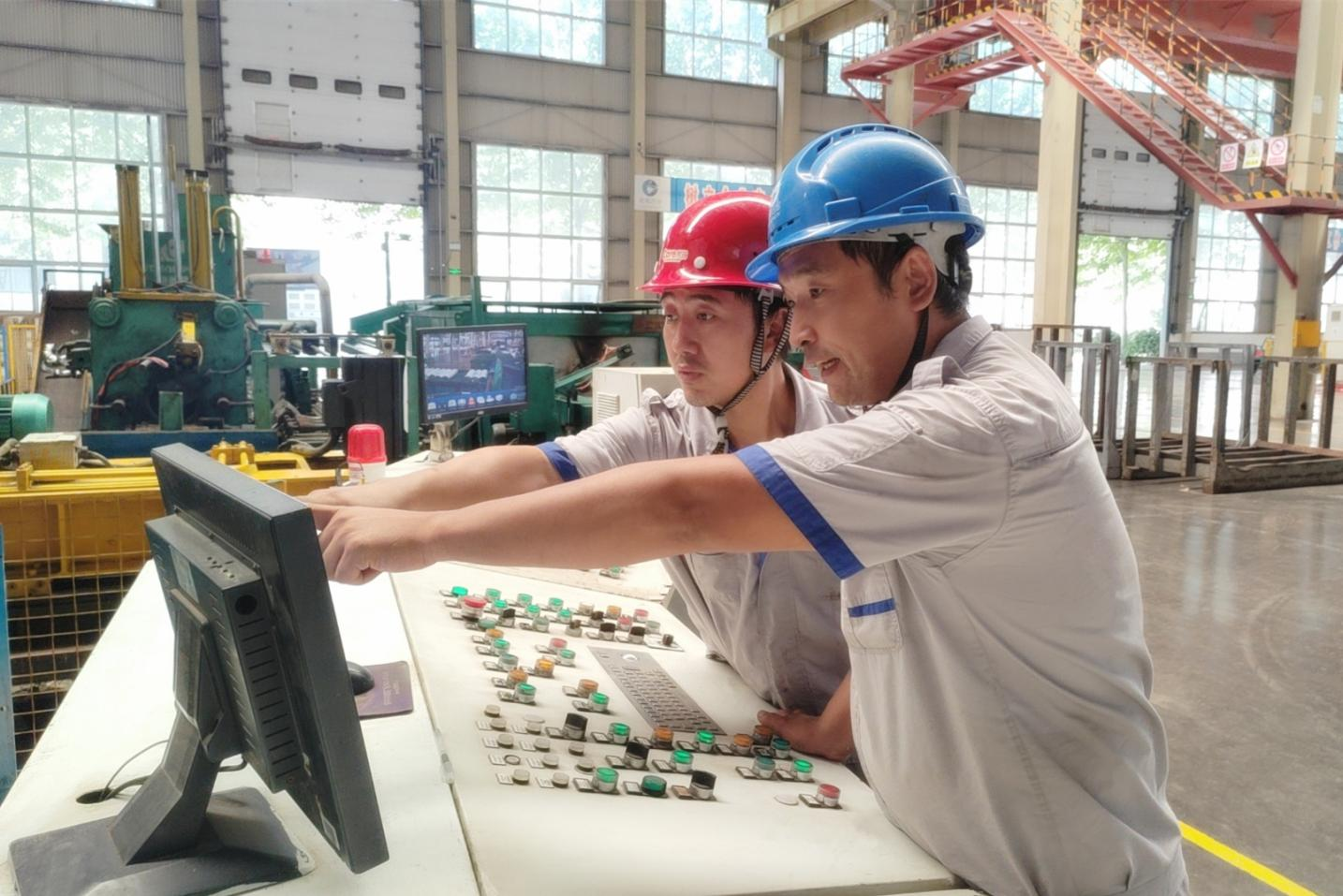 裕航合金擠壓三車間,26兆牛擠壓機班長韓寶磊(右)對新員工孫雙喜進行手把手培訓,詳細講解擠壓機操作技能和工藝單執(zhí)行情況,讓新員工盡快熟悉崗位職責,掌握機臺工藝流程及各項指標參數(shù),為新員工順利上崗、投入工作發(fā)揮積極傳幫帶作用。