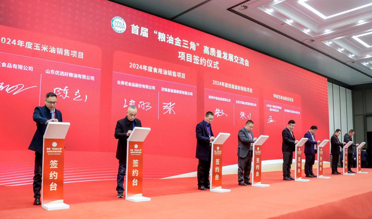 期間,首屆“糧油金三角”高質(zhì)量發(fā)展交流會上,作為全國第一個“糧食產(chǎn)業(yè)經(jīng)濟發(fā)展示范市”、首個糧油食品加工產(chǎn)業(yè)集群主營業(yè)務收入超千億地級市,濱州組織30余家糧油食品企業(yè)參展,重點展示濱州市糧食產(chǎn)業(yè)龍頭企業(yè)融合發(fā)展,推動鄉(xiāng)村振興的最新成果,大力開展招商引資活動,并吸引全國糧油經(jīng)銷商集中采購訂貨。長壽花食品作為品牌企業(yè)代表上臺簽約。