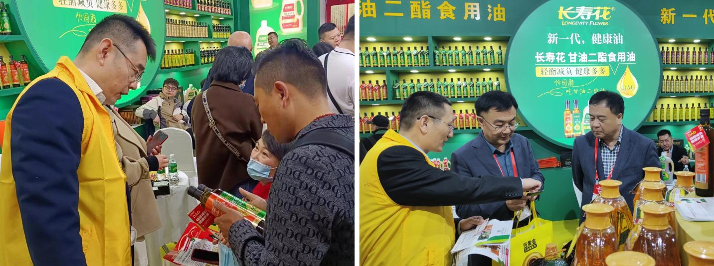 相約蓉城,花綻精彩。在長壽花食品特色展區(qū),全系產(chǎn)品展示、新品重磅亮相,加上全國區(qū)域市場主要負(fù)責(zé)人的現(xiàn)場互動宣講,吸引了眾多與會人員參與互動,展位前滿滿都是前來咨詢的客商。值得關(guān)注的是,伴隨著健康消費理念的升級,首次亮相糖酒會的長壽花甘油二酯(DAG含量20%—80%)系列食用油,憑借其輕酯特質(zhì)和健康屬性,以及在業(yè)內(nèi)的產(chǎn)業(yè)化引領(lǐng)作用,實力出圈,強勢吸粉,成為本屆展會最為閃耀的新品之一。