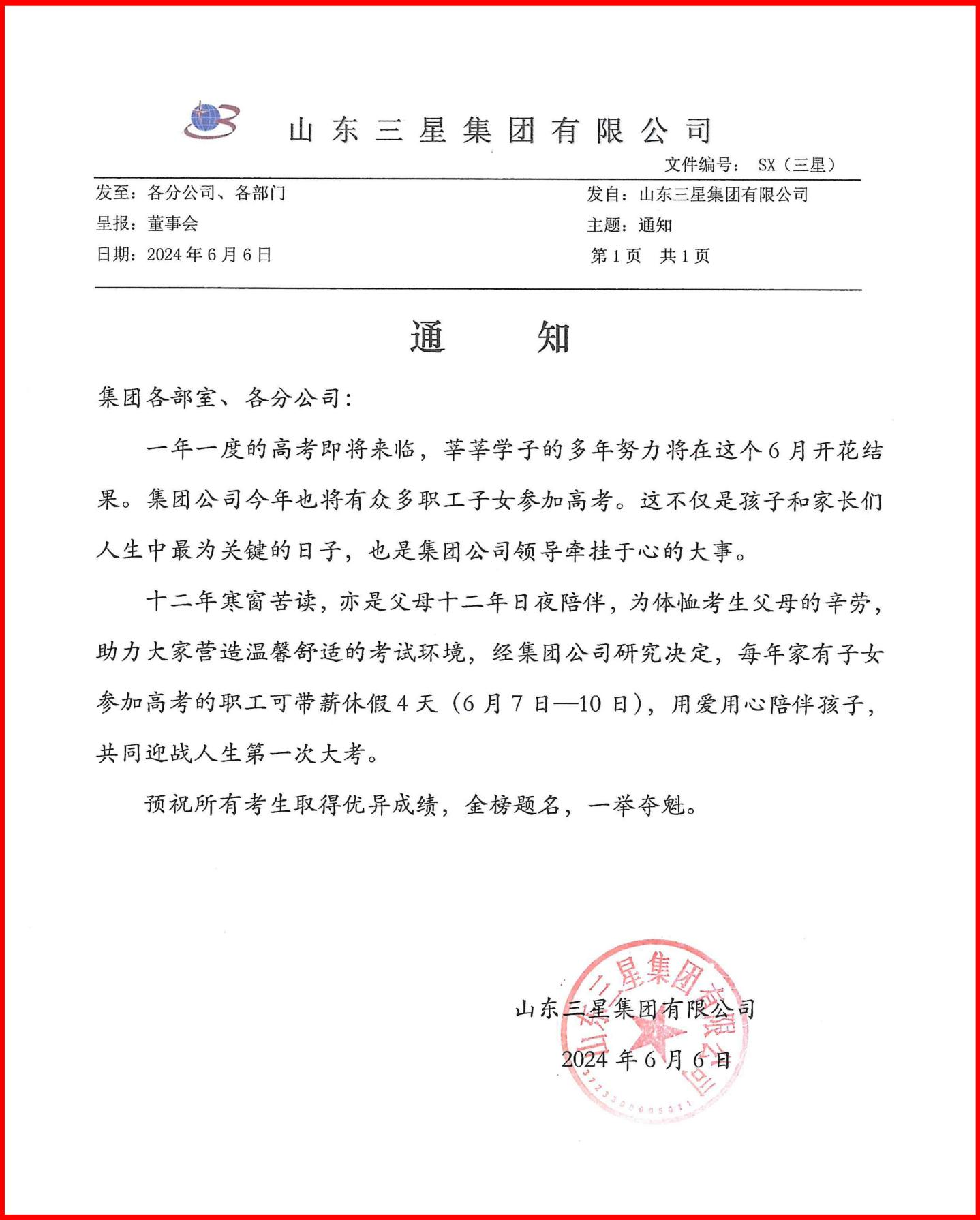 一年一度的高考即將來臨,莘莘學子的多年努力將在這個6月開花結果。今年,山東三星集團也將有眾多職工子女參加高考,這不僅是孩子和家長們人生中最為關鍵的日子,也是集團公司領導牽掛于心的大事。