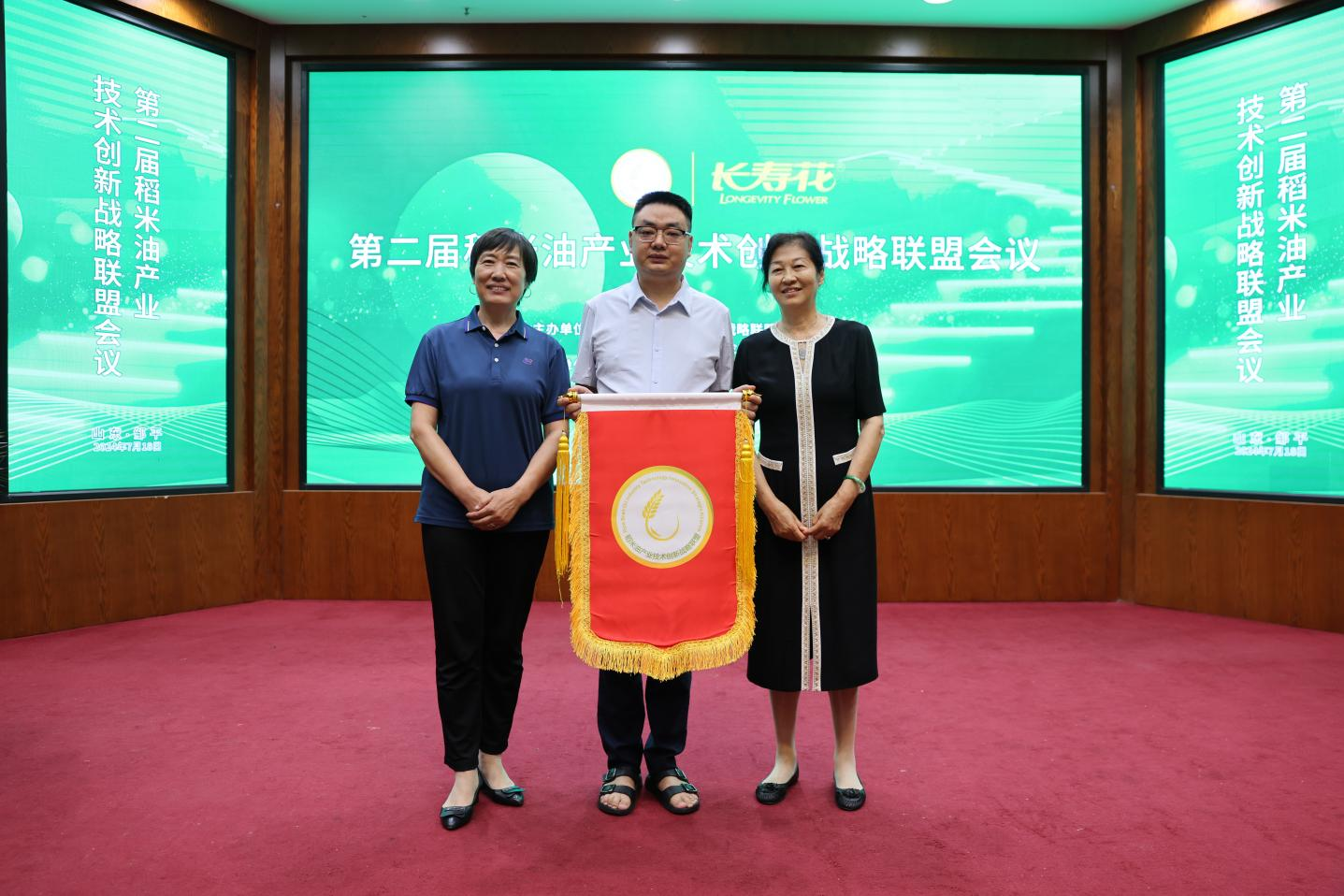 大會同時舉辦了第三屆稻米油產業(yè)技術創(chuàng)新戰(zhàn)略聯盟會議授旗儀式,張桂鳳及長壽花食品、第三屆聯盟會議承辦單位代表完成旗幟轉交,從山東到湖北,從黃河之濱到長江之畔,在場與會領導嘉賓共同見證了授旗使命的傳遞和接力。