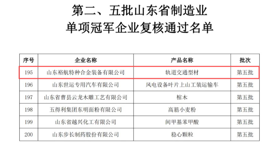 近日,省工信廳公布《第八批山東省制造業(yè)單項冠軍企業(yè)和通過復核的第二、五批制造業(yè)單項冠軍企業(yè)名單》,山東裕航特種合金裝備有限公司憑借“軌道交通型材”成功通過山東省制造業(yè)單項冠軍企業(yè)復核。