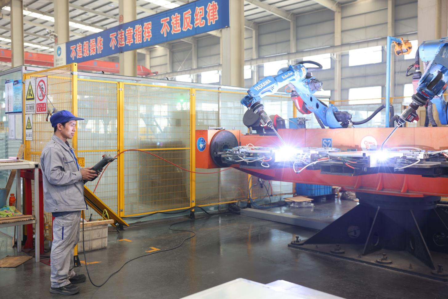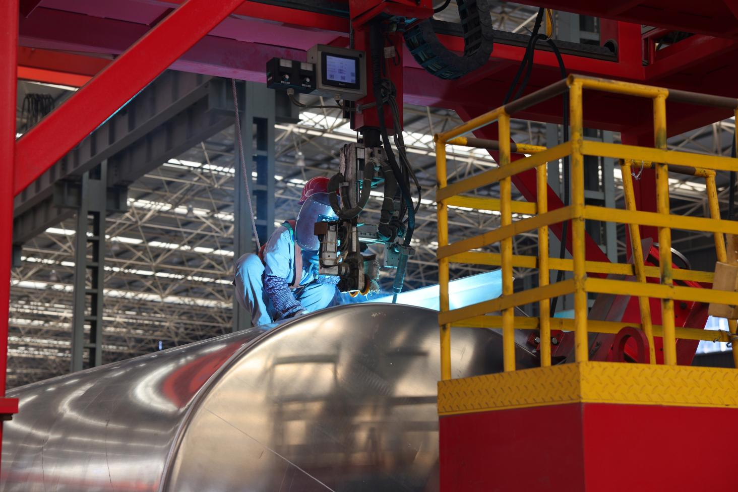 →機(jī)械公司罐車生產(chǎn)線上,員工正在進(jìn)行出口產(chǎn)品的焊接作業(yè)←