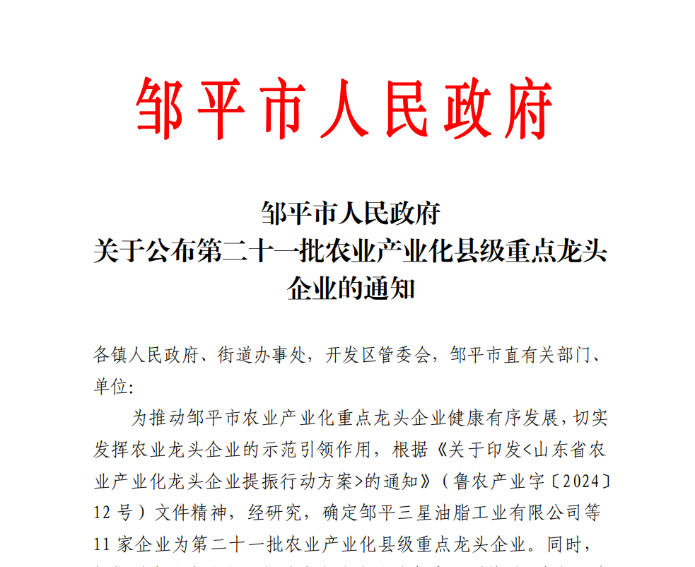 近日,鄒平市人民政府公布了新一批農(nóng)業(yè)產(chǎn)業(yè)化縣級(jí)重點(diǎn)龍頭企業(yè)名單,集團(tuán)旗下鄒平三星油脂工業(yè)有限公司被認(rèn)定為農(nóng)業(yè)產(chǎn)業(yè)化縣級(jí)重點(diǎn)龍頭企業(yè)。