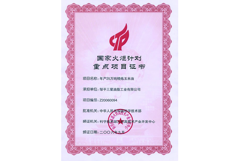 國家火炬計(jì)劃重點(diǎn)項(xiàng)目證書
