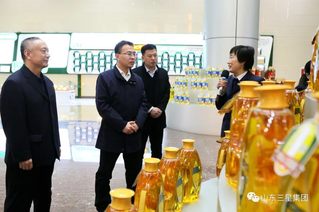 王明峰對李群一行的到來表示歡迎,并分享了企業(yè)在推進玉米精深加工、延展高端糧油產(chǎn)業(yè)鏈條等領(lǐng)域的實踐經(jīng)驗和探索成果,就企業(yè)來年高端糧油產(chǎn)業(yè)發(fā)展規(guī)劃和戰(zhàn)略布局作詳細介紹。他表示,多年來,在各級黨委政府關(guān)心和支持下,山東三星集團搶抓機遇、主動作為,時刻不忘農(nóng)業(yè)產(chǎn)業(yè)化龍頭企業(yè)責任擔當,在高端糧油產(chǎn)業(yè)化創(chuàng)新、規(guī)范化生產(chǎn)、專業(yè)化運營等領(lǐng)域持續(xù)發(fā)力。自主創(chuàng)新研發(fā)了長壽花濃香玉米油、長壽花零反式脂肪高養(yǎng)玉米油等一系列新型高端食用油產(chǎn)品,上市箸下“本釀造”系列調(diào)味品,著力豐富國民餐桌,健康國民生活;加速構(gòu)建玉米油全產(chǎn)業(yè)鏈布局,全力提升農(nóng)業(yè)綜合生產(chǎn)能力,助力推動農(nóng)業(yè)增效農(nóng)民增收;并深度參與“齊魯糧油”公眾品牌建設(shè),強力拓展新型品牌營銷推廣渠道,致力打造核心競爭力更強、農(nóng)業(yè)產(chǎn)業(yè)化帶動效益更明顯的優(yōu)質(zhì)民族糧油品牌。王明峰還提到,新的一年,山東三星集團將立足自身稟賦優(yōu)勢,強化優(yōu)質(zhì)渠道拓展及品牌價值提升,在深度融入新發(fā)展格局過程中展現(xiàn)新作為,為建設(shè)現(xiàn)代化富強文明新鄒平,促進農(nóng)村經(jīng)濟高質(zhì)量發(fā)展貢獻新力量。