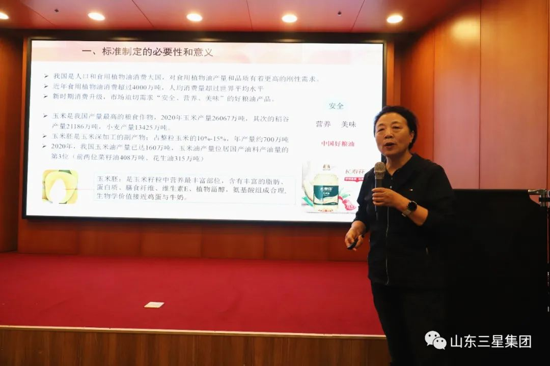 會上,中國糧油學(xué)會油脂分會副秘書長、河南工業(yè)大學(xué)教授劉玉蘭作標準報告,講述了《特級玉米油》標準制定的必要性和重要性,介紹了特級玉米油標準的適用范圍、規(guī)范性引用文件、術(shù)語和定義、質(zhì)量要求、檢驗方法、檢驗規(guī)則等八個方面內(nèi)容。她表示此項標準的制定有著扎實的工作基礎(chǔ)和厚實的研發(fā)成果支撐,特別是第一起草單位長壽花食品對《特級玉米油》標準制定及中國玉米油行業(yè)發(fā)展起到了當(dāng)之無愧的引領(lǐng)和推動作用,并期待標準盡快發(fā)布實施,助力國家玉米油產(chǎn)品和技術(shù)創(chuàng)新升級。